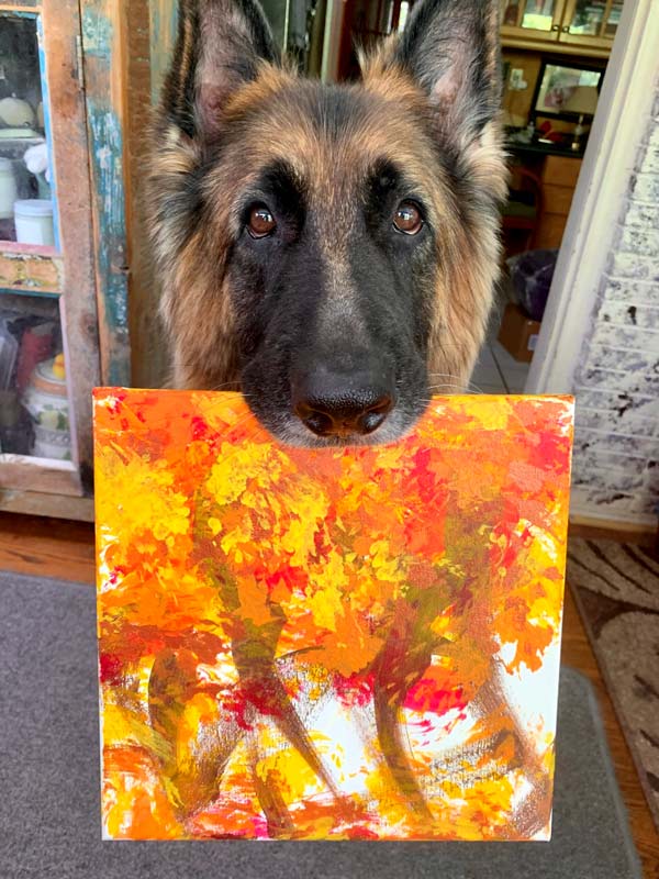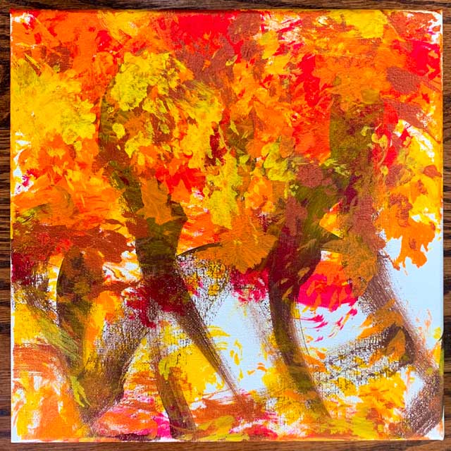 Schultz’s piece depicts a fall scene of trees with colorful leaves. He did some tree trunks in brown with a regular paint brush first and then used a big puffy make up brush to add the colorful red, orange and yellow leaves.